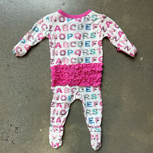 Print Muffin Ruffle Footie with 2 Way Zipper in Natural ABC Monsters